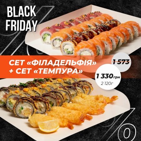 Хрустка темпура, ніжна філадельфія, подвійне задоволення за чорноп’ятничною ціною.